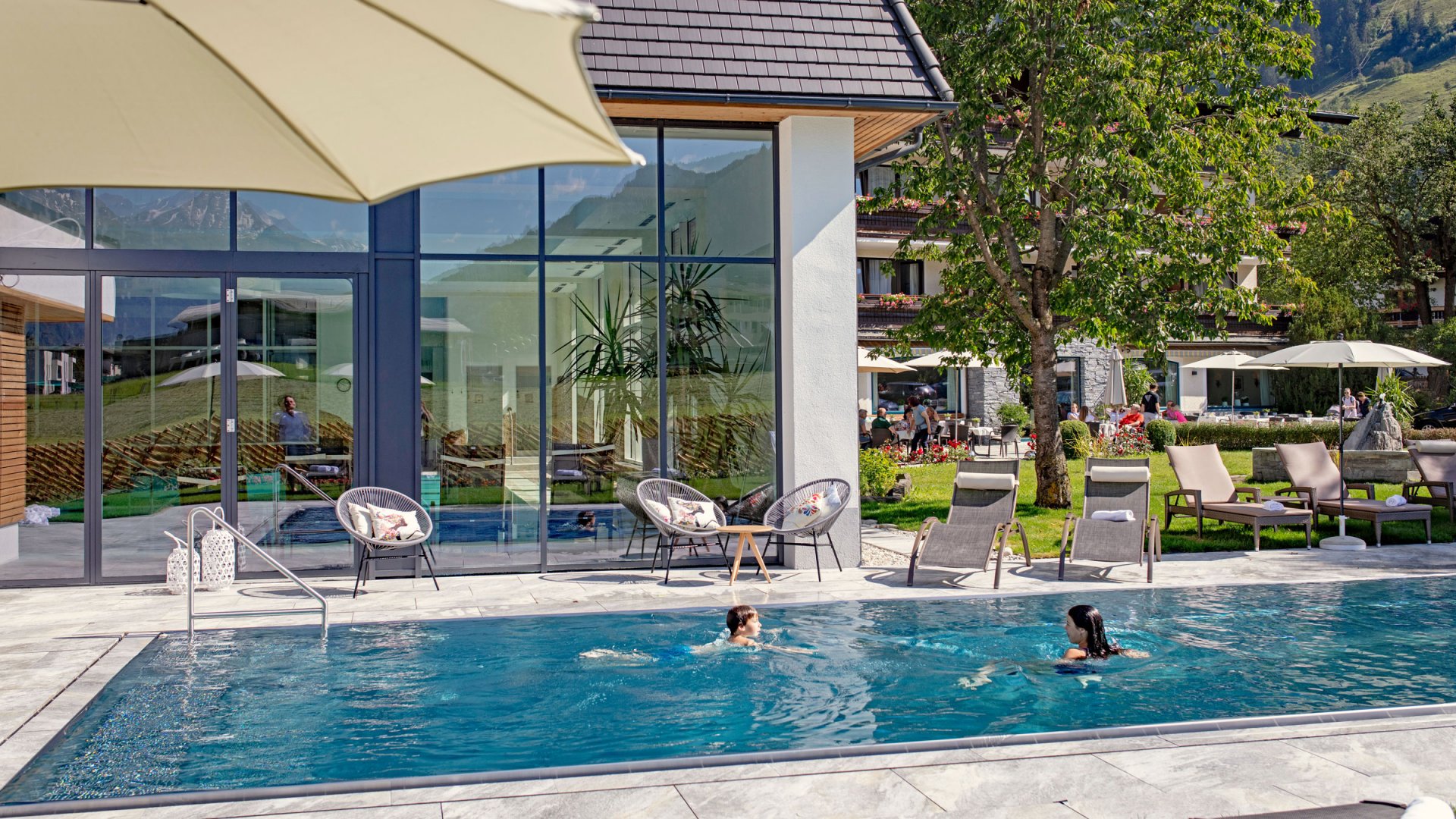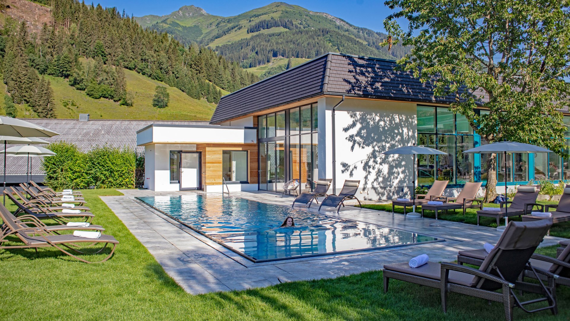 Panoramahallenbad! Sie ziehen Ihre Bahnen und lassen den Blick durch unseren Garten und die Gipfel rund um den Rauriserhof schweifen. Unser Inndoor Pool ist 15m lang und 8m breit. Damit kommen alle die gerne sportlich schwimmen auf Ihre Kosten.